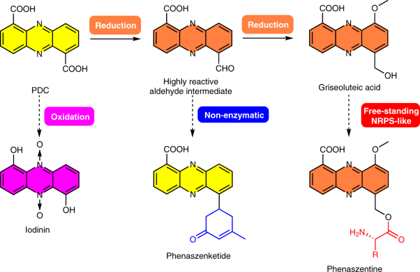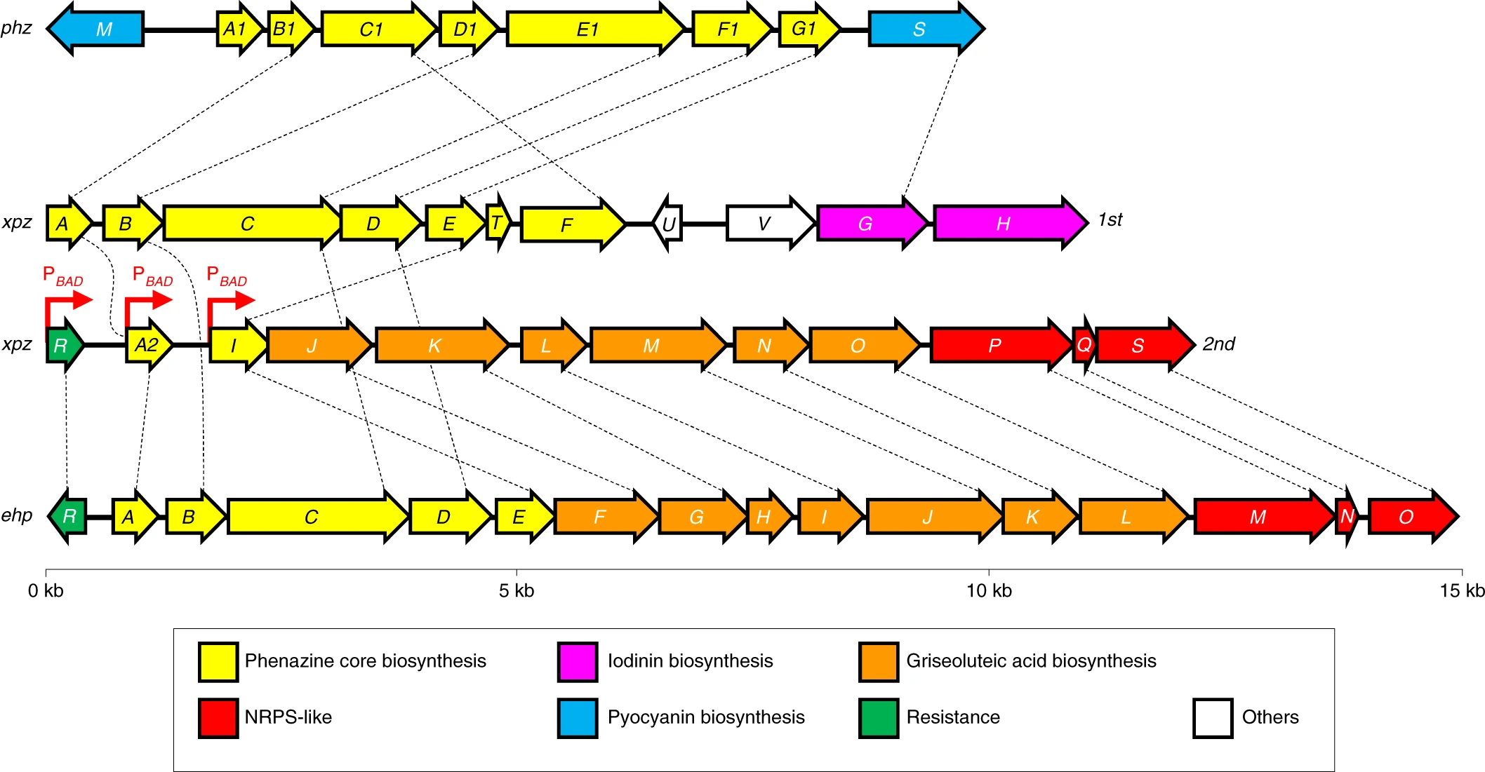Dual phenazine gene clusters enable diversification during biosynthesis.